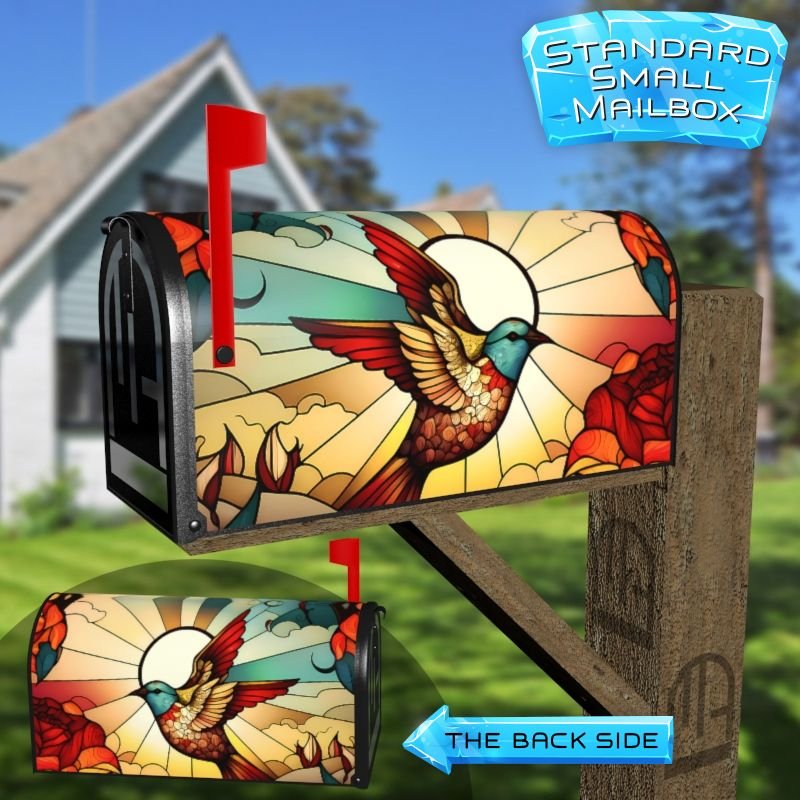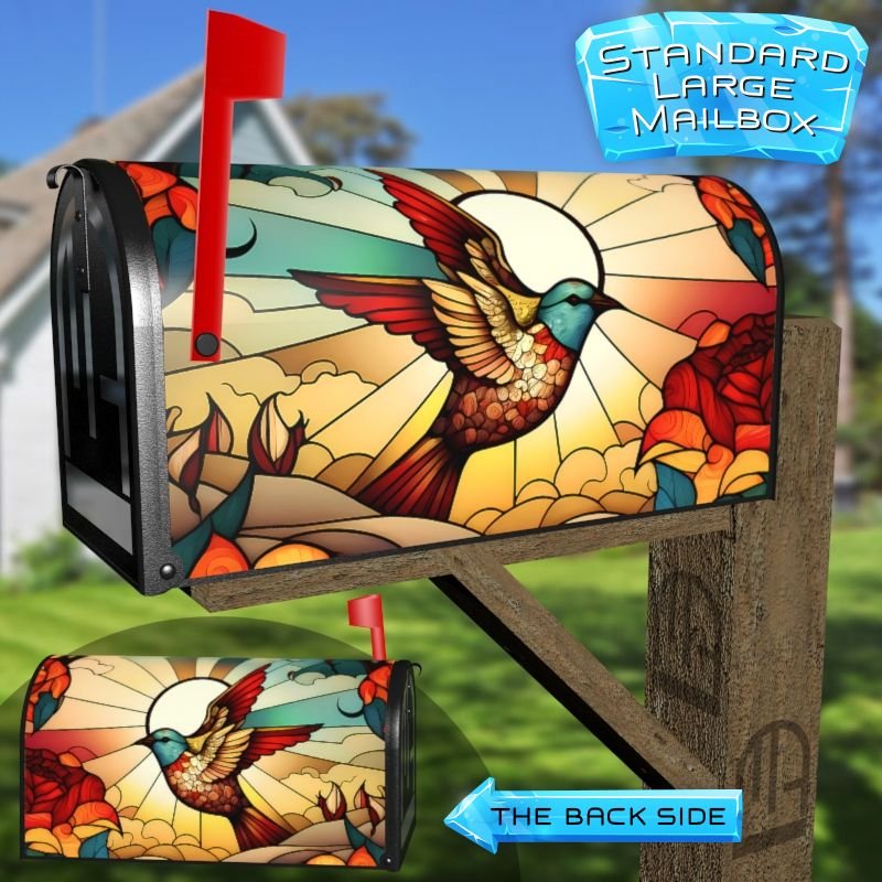 Dressing up your rural farm mailbox with the Stained Glass Spring Bird Design mailbox cover is an easy way to convert it into a unique and special item. These covers require a smooth surface, so they are compatible with rural farm mailboxes that do not have any embossed decorations or signs. Magnetic mailbox covers work with steel boxes only, while self-adhesive vinyl covers are available for aluminum, plastic and steel boxes. If your mailbox is not compatible with these covers, you can purchase a brand new mailbox with a preinstalled cover. Additionally, you have the option to create a custom rural farm mailbox cover with your own pictures, name, street number, etc.