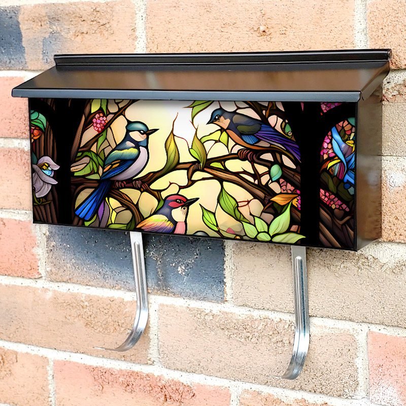 Applying your Stained Glass Spring Birds Design townhouse / ranch mailbox cover it’s pretty easy to convert your mailbox to a special and unique item. These covers require a flat surface, so they work with townhouse / ranch mailboxes that do not have any embossed decoration or signs. Magnetic mailbox covers work with steel boxes, for aluminum and plastic boxes we offer the self-adhesive vinyl covers. In case your mailbox doesn’t work with these covers, you can purchase the preinstalled cover on a brand new mailbox as well. Also, you can create your custom townhouse / ranch mailbox cover using you own pictures, adding your name, street number, etc.