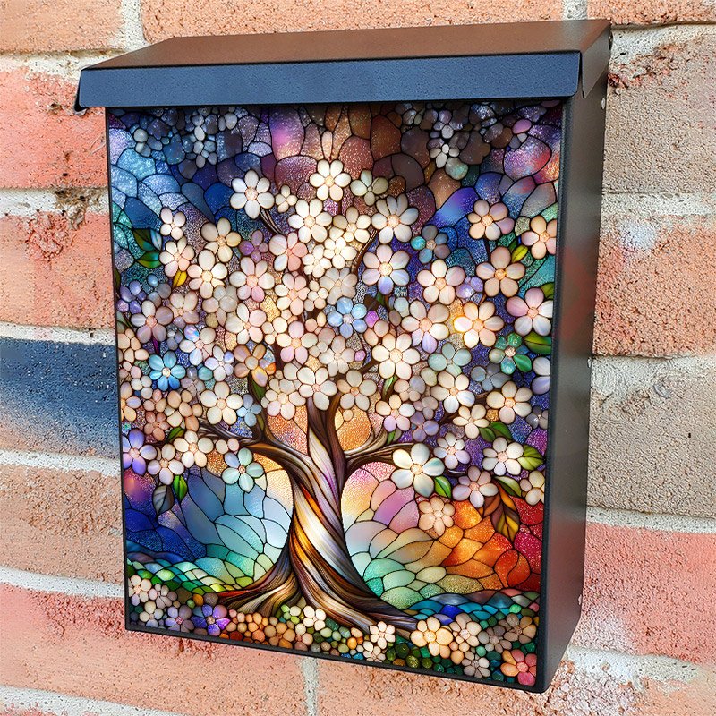 With this Stained Glass Spring Cherry Tree 3 colonial mailbox cover it’s pretty easy to convert your mailbox to a special and unique item. These covers require a flat surface, so they work with colonial mailboxes that do not have any embossed decoration or signs. Magnetic mailbox covers work with steel colonial boxes only, while self-adhesive vinyl covers are available for aluminum, plastic and steel boxes. We also offer both self-adhesive and magnetic covers with regular opaque white vinyl or reflective vinyl, which works similarly to license plates or road signs. The reflective option makes the entire cover’s surface reflective, ensuring visibility at night. In case your mailbox doesn’t work with these covers, you can purchase the preinstalled cover on a brand new mailbox as well. Also, you can create your custom colonial mailbox cover using you own pictures, adding your name, street number, etc.
