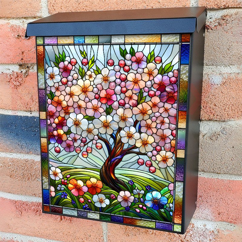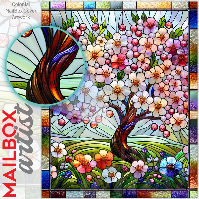 With this Stained Glass Spring Cherry Tree colonial mailbox cover it’s pretty easy to convert your mailbox to a special and unique item. These covers require a flat surface, so they work with colonial mailboxes that do not have any embossed decoration or signs. Magnetic mailbox covers work with steel colonial boxes only, while self-adhesive vinyl covers are available for aluminum, plastic and steel boxes. We also offer both self-adhesive and magnetic covers with regular opaque white vinyl or reflective vinyl, which works similarly to license plates or road signs. The reflective option makes the entire cover’s surface reflective, ensuring visibility at night. In case your mailbox doesn’t work with these covers, you can purchase the preinstalled cover on a brand new mailbox as well. Also, you can create your custom colonial mailbox cover using you own pictures, adding your name, street number, etc.
