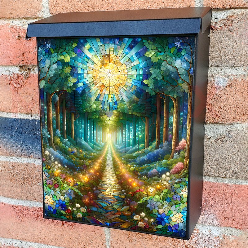 With this Stained Glass Spring Forest Path colonial mailbox cover it’s pretty easy to convert your mailbox to a special and unique item. These covers require a flat surface, so they work with colonial mailboxes that do not have any embossed decoration or signs. Magnetic mailbox covers work with steel colonial boxes only, while self-adhesive vinyl covers are available for aluminum, plastic and steel boxes. We also offer both self-adhesive and magnetic covers with regular opaque white vinyl or reflective vinyl, which works similarly to license plates or road signs. The reflective option makes the entire cover’s surface reflective, ensuring visibility at night. In case your mailbox doesn’t work with these covers, you can purchase the preinstalled cover on a brand new mailbox as well. Also, you can create your custom colonial mailbox cover using you own pictures, adding your name, street number, etc.