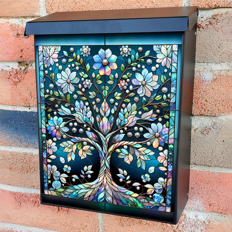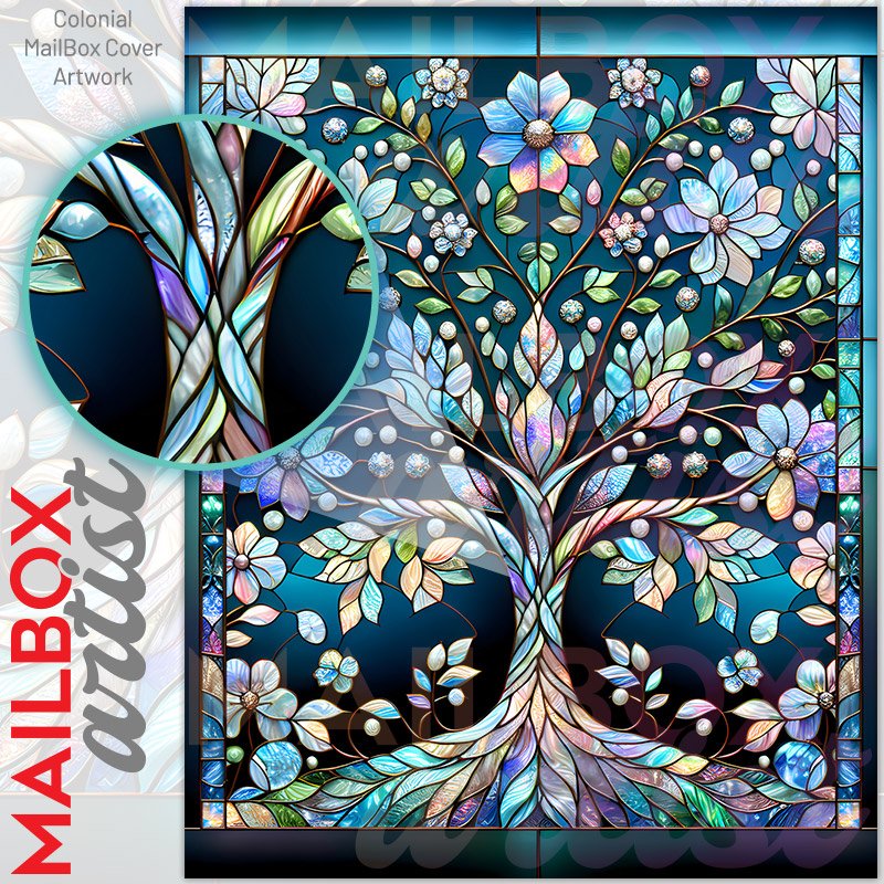 With this Stained Glass Spring Tree 2 colonial mailbox cover it’s pretty easy to convert your mailbox to a special and unique item. These covers require a flat surface, so they work with colonial mailboxes that do not have any embossed decoration or signs. Magnetic mailbox covers work with steel colonial boxes only, while self-adhesive vinyl covers are available for aluminum, plastic and steel boxes. We also offer both self-adhesive and magnetic covers with regular opaque white vinyl or reflective vinyl, which works similarly to license plates or road signs. The reflective option makes the entire cover’s surface reflective, ensuring visibility at night. In case your mailbox doesn’t work with these covers, you can purchase the preinstalled cover on a brand new mailbox as well. Also, you can create your custom colonial mailbox cover using you own pictures, adding your name, street number, etc.