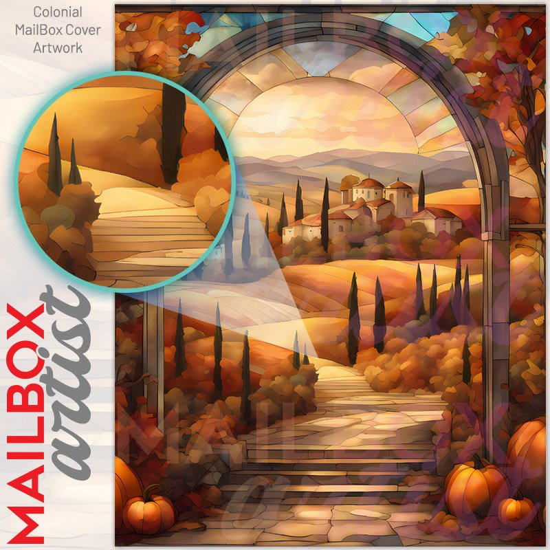 With this Stained Glass Tuscan Autumn colonial mailbox cover it’s pretty easy to convert your mailbox to a special and unique item. These covers require a flat surface, so they work with colonial mailboxes that do not have any embossed decoration or signs. Magnetic mailbox covers work with steel colonial boxes only, while self-adhesive vinyl covers are available for aluminum, plastic and steel boxes. We also offer both self-adhesive and magnetic covers with regular opaque white vinyl or reflective vinyl, which works similarly to license plates or road signs. The reflective option makes the entire cover’s surface reflective, ensuring visibility at night. In case your mailbox doesn’t work with these covers, you can purchase the preinstalled cover on a brand new mailbox as well. Also, you can create your custom colonial mailbox cover using you own pictures, adding your name, street number, etc.