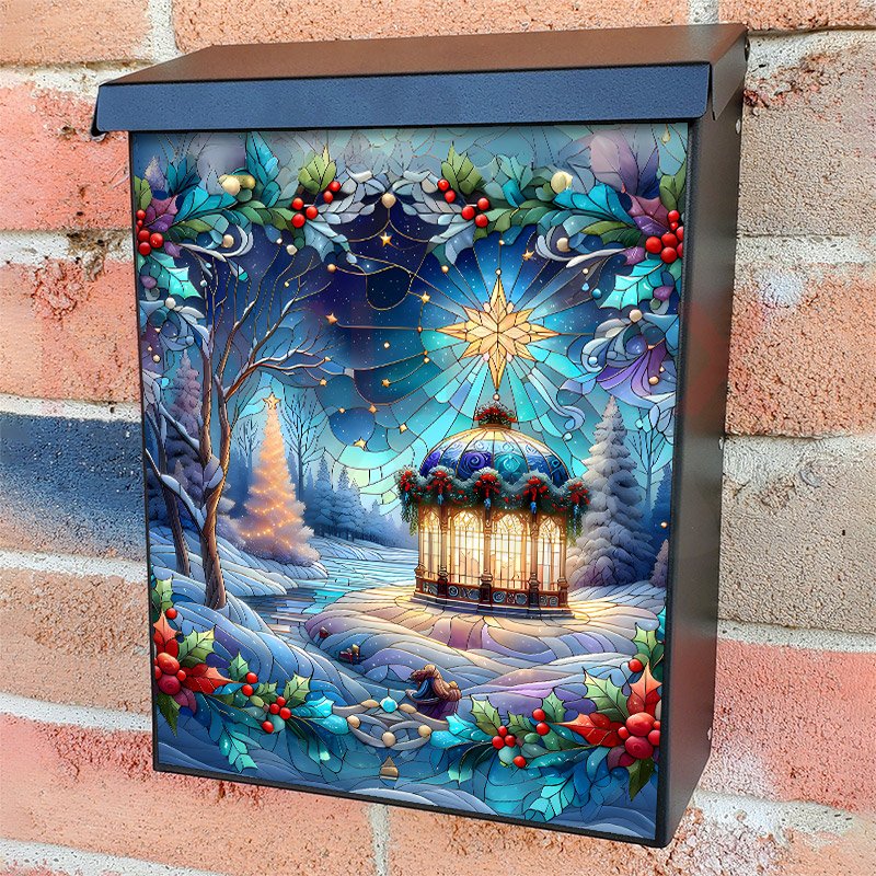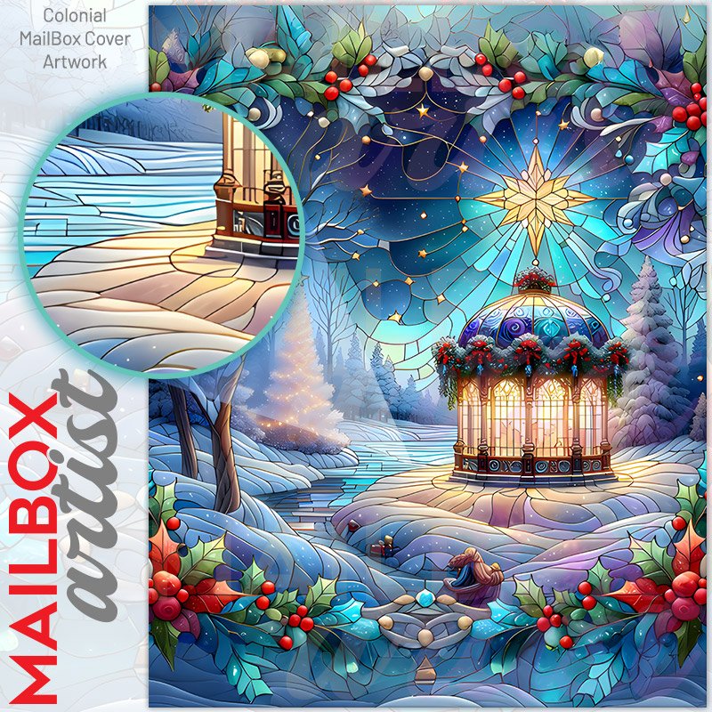 With this Stained Glass Winter Gazebo colonial mailbox cover it’s pretty easy to convert your mailbox to a special and unique item. These covers require a flat surface, so they work with colonial mailboxes that do not have any embossed decoration or signs. Magnetic mailbox covers work with steel colonial boxes only, while self-adhesive vinyl covers are available for aluminum, plastic and steel boxes. We also offer both self-adhesive and magnetic covers with regular opaque white vinyl or reflective vinyl, which works similarly to license plates or road signs. The reflective option makes the entire cover’s surface reflective, ensuring visibility at night. In case your mailbox doesn’t work with these covers, you can purchase the preinstalled cover on a brand new mailbox as well. Also, you can create your custom colonial mailbox cover using you own pictures, adding your name, street number, etc.