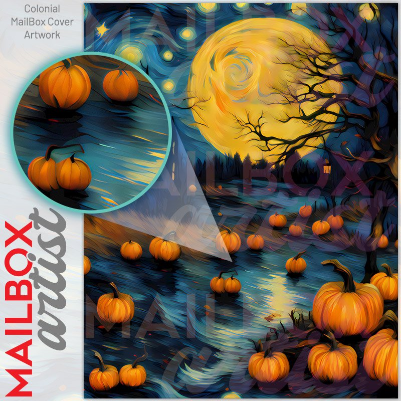 With this Starry Night Church and Pumpkins colonial mailbox cover it’s pretty easy to convert your mailbox to a special and unique item. These covers require a flat surface, so they work with colonial mailboxes that do not have any embossed decoration or signs. Magnetic mailbox covers work with steel colonial boxes only, while self-adhesive vinyl covers are available for aluminum, plastic and steel boxes. We also offer both self-adhesive and magnetic covers with regular opaque white vinyl or reflective vinyl, which works similarly to license plates or road signs. The reflective option makes the entire cover’s surface reflective, ensuring visibility at night. In case your mailbox doesn’t work with these covers, you can purchase the preinstalled cover on a brand new mailbox as well. Also, you can create your custom colonial mailbox cover using you own pictures, adding your name, street number, etc.