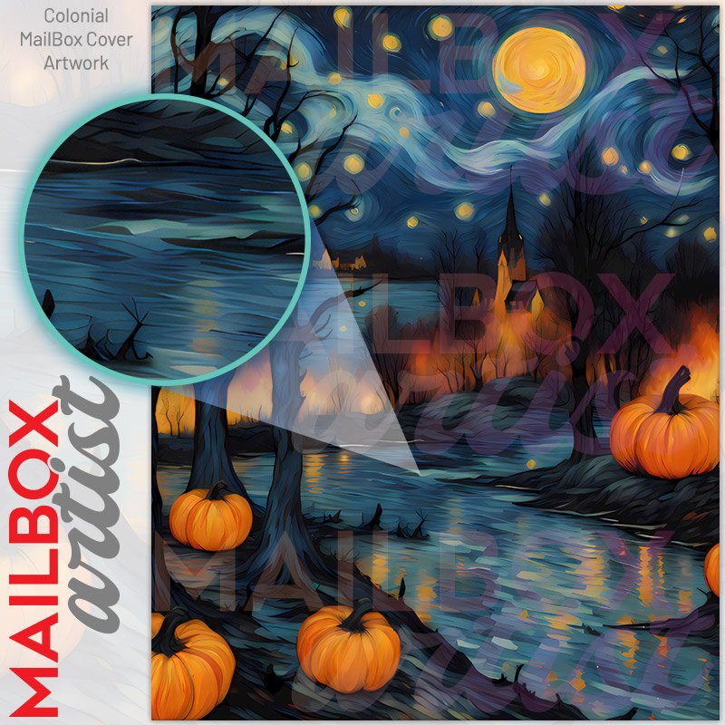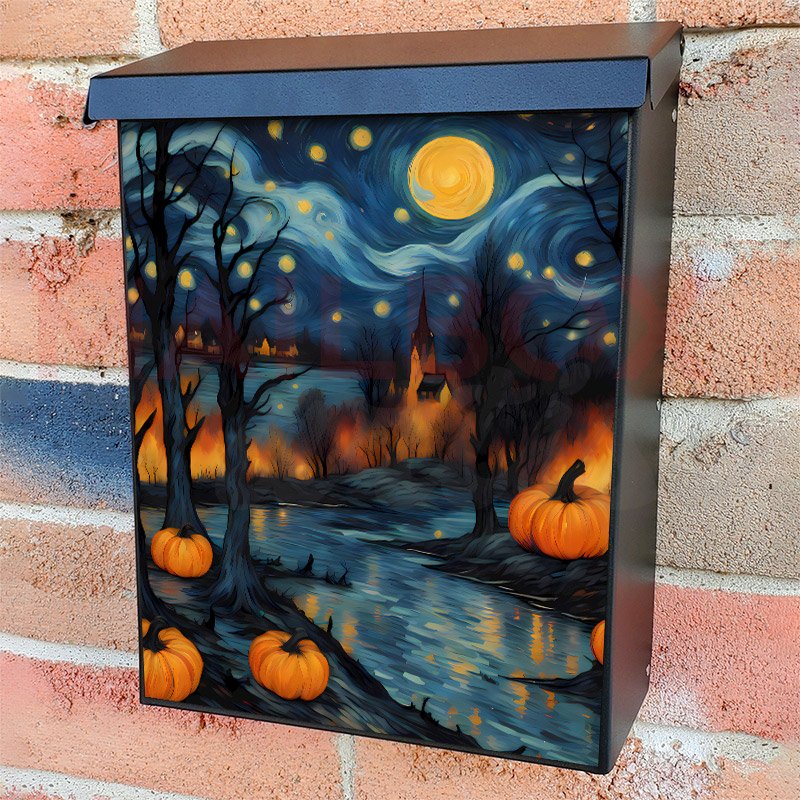 With this Starry October Night colonial mailbox cover it’s pretty easy to convert your mailbox to a special and unique item. These covers require a flat surface, so they work with colonial mailboxes that do not have any embossed decoration or signs. Magnetic mailbox covers work with steel colonial boxes only, while self-adhesive vinyl covers are available for aluminum, plastic and steel boxes. We also offer both self-adhesive and magnetic covers with regular opaque white vinyl or reflective vinyl, which works similarly to license plates or road signs. The reflective option makes the entire cover’s surface reflective, ensuring visibility at night. In case your mailbox doesn’t work with these covers, you can purchase the preinstalled cover on a brand new mailbox as well. Also, you can create your custom colonial mailbox cover using you own pictures, adding your name, street number, etc.