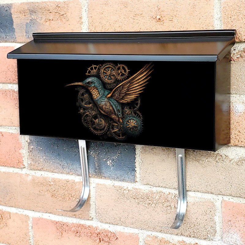 Applying your Steampunk Hummingbird With Clockwork Gears Metal And Patina townhouse / ranch mailbox cover it’s pretty easy to convert your mailbox to a special and unique item. These covers require a flat surface, so they work with townhouse / ranch mailboxes that do not have any embossed decoration or signs. Magnetic mailbox covers work with steel boxes, for aluminum and plastic boxes we offer the self-adhesive vinyl covers. In case your mailbox doesn’t work with these covers, you can purchase the preinstalled cover on a brand new mailbox as well. Also, you can create your custom townhouse / ranch mailbox cover using you own pictures, adding your name, street number, etc.