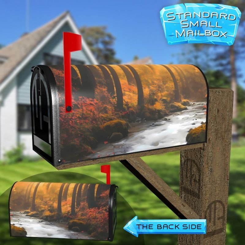 Dressing up your rural farm mailbox with the Stream in the Autumn Woods mailbox cover is an easy way to convert it into a unique and special item. These covers require a smooth surface, so they are compatible with rural farm mailboxes that do not have any embossed decorations or signs. Magnetic mailbox covers work with steel boxes only, while self-adhesive vinyl covers are available for aluminum, plastic and steel boxes. If your mailbox is not compatible with these covers, you can purchase a brand new mailbox with a preinstalled cover. Additionally, you have the option to create a custom rural farm mailbox cover with your own pictures, name, street number, etc.