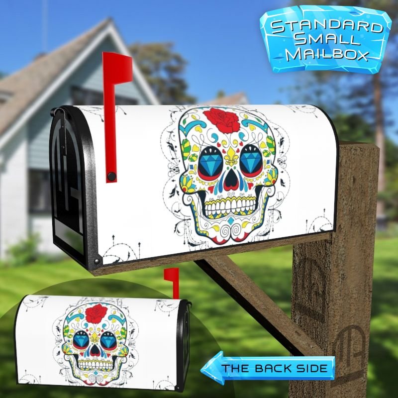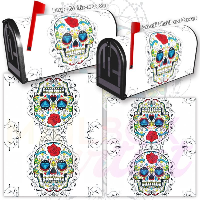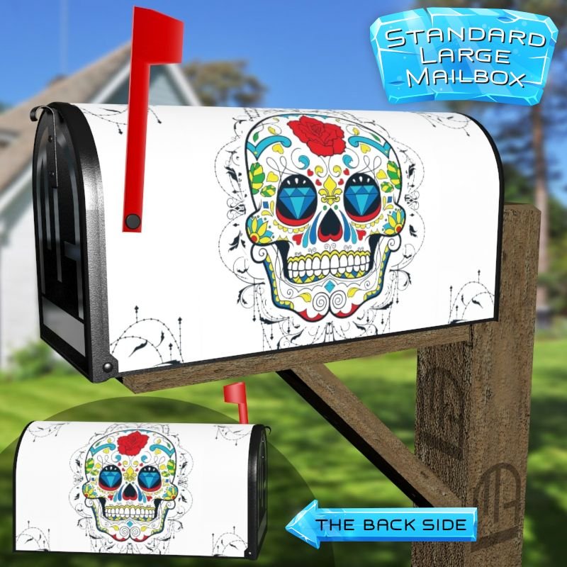 Dressing up your rural farm mailbox with the Sugar Skull and Flowers #3 mailbox cover is an easy way to convert it into a unique and special item. These covers require a smooth surface, so they are compatible with rural farm mailboxes that do not have any embossed decorations or signs. Magnetic mailbox covers work with steel boxes only, while self-adhesive vinyl covers are available for aluminum, plastic and steel boxes. If your mailbox is not compatible with these covers, you can purchase a brand new mailbox with a preinstalled cover. Additionally, you have the option to create a custom rural farm mailbox cover with your own pictures, name, street number, etc.