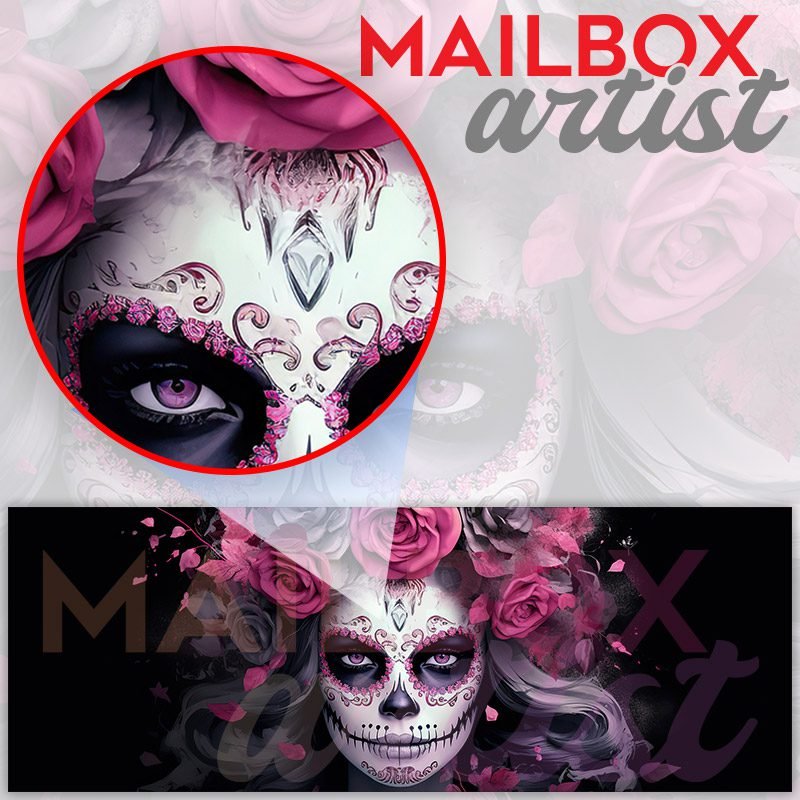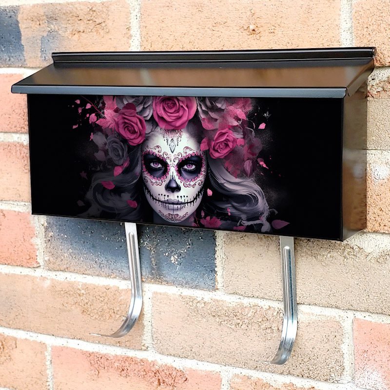 Applying your Sugar Skull Lady With Pink Roses townhouse / ranch mailbox cover it’s pretty easy to convert your mailbox to a special and unique item. These covers require a flat surface, so they work with townhouse / ranch mailboxes that do not have any embossed decoration or signs. Magnetic mailbox covers work with steel boxes, for aluminum and plastic boxes we offer the self-adhesive vinyl covers. In case your mailbox doesn’t work with these covers, you can purchase the preinstalled cover on a brand new mailbox as well. Also, you can create your custom townhouse / ranch mailbox cover using you own pictures, adding your name, street number, etc.
