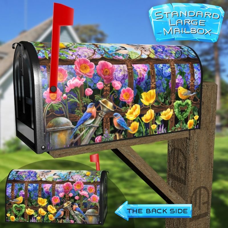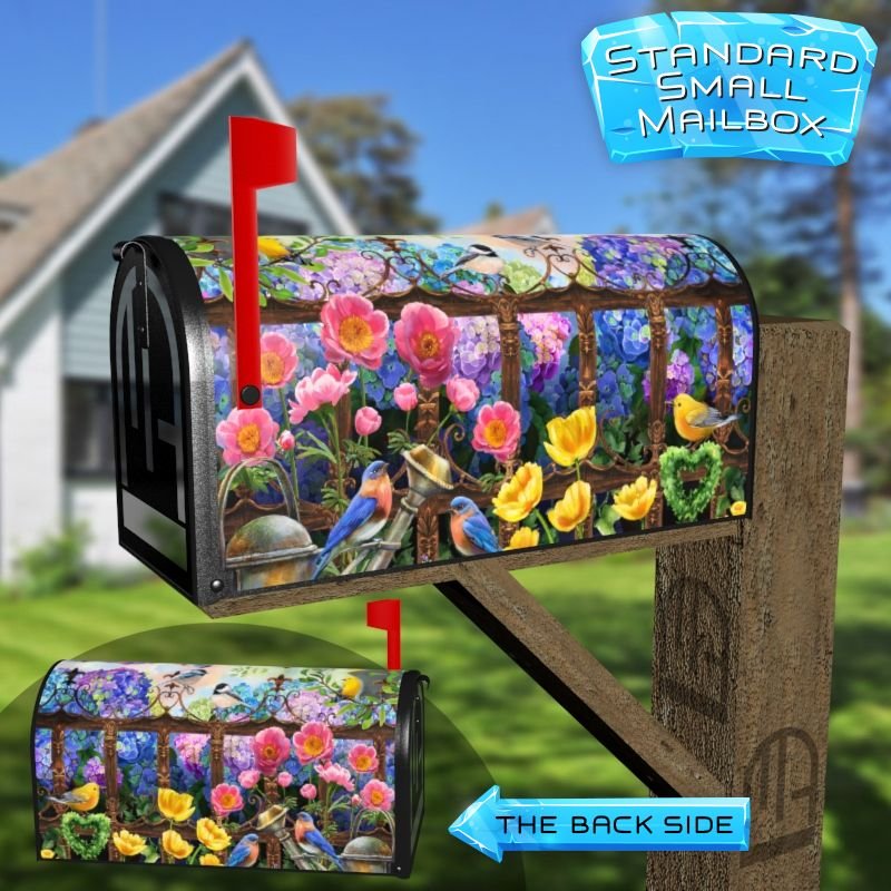 Dressing up your rural farm mailbox with the Summer Cottage Garden with Birds mailbox cover is an easy way to convert it into a unique and special item. These covers require a smooth surface, so they are compatible with rural farm mailboxes that do not have any embossed decorations or signs. Magnetic mailbox covers work with steel boxes only, while self-adhesive vinyl covers are available for aluminum, plastic and steel boxes. If your mailbox is not compatible with these covers, you can purchase a brand new mailbox with a preinstalled cover. Additionally, you have the option to create a custom rural farm mailbox cover with your own pictures, name, street number, etc.