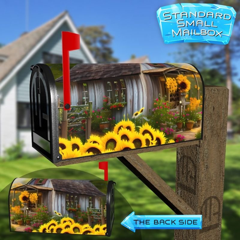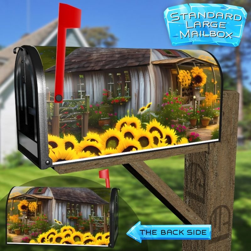 Dressing up your rural farm mailbox with the Sunflower Cottage #4 mailbox cover is an easy way to convert it into a unique and special item. These covers require a smooth surface, so they are compatible with rural farm mailboxes that do not have any embossed decorations or signs. Magnetic mailbox covers work with steel boxes only, while self-adhesive vinyl covers are available for aluminum, plastic and steel boxes. If your mailbox is not compatible with these covers, you can purchase a brand new mailbox with a preinstalled cover. Additionally, you have the option to create a custom rural farm mailbox cover with your own pictures, name, street number, etc.