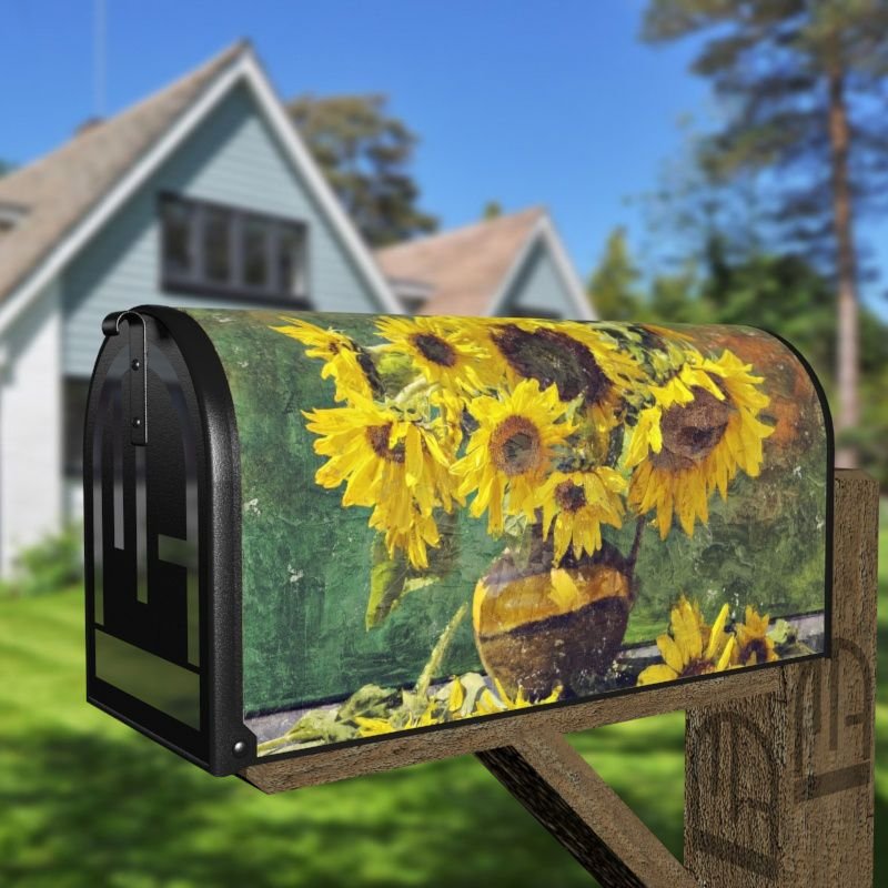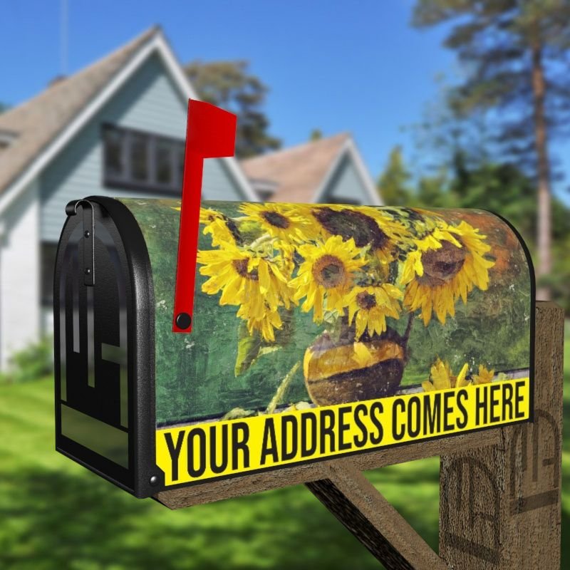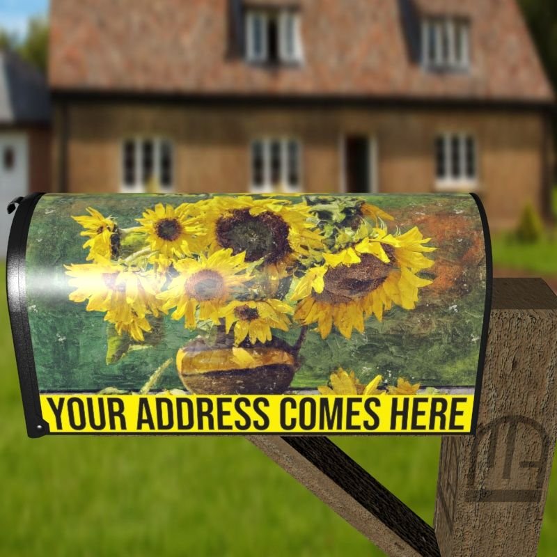 Grab this creative Sunflowers in the Table rural/curbside/farm mailbox cover as self adhesive vinyl or magnetic cover. Our magnetic covers have the magnetic surface under the whole design, not only two magnet strips like in cheaper products. We also offer both the self adhesive and the magnetic covers with regular opaque white vinyl or reflective vinyl which works the same way as the licence plates or road signs; pretty visible at night. We make these covers for both large and small mailboxes.