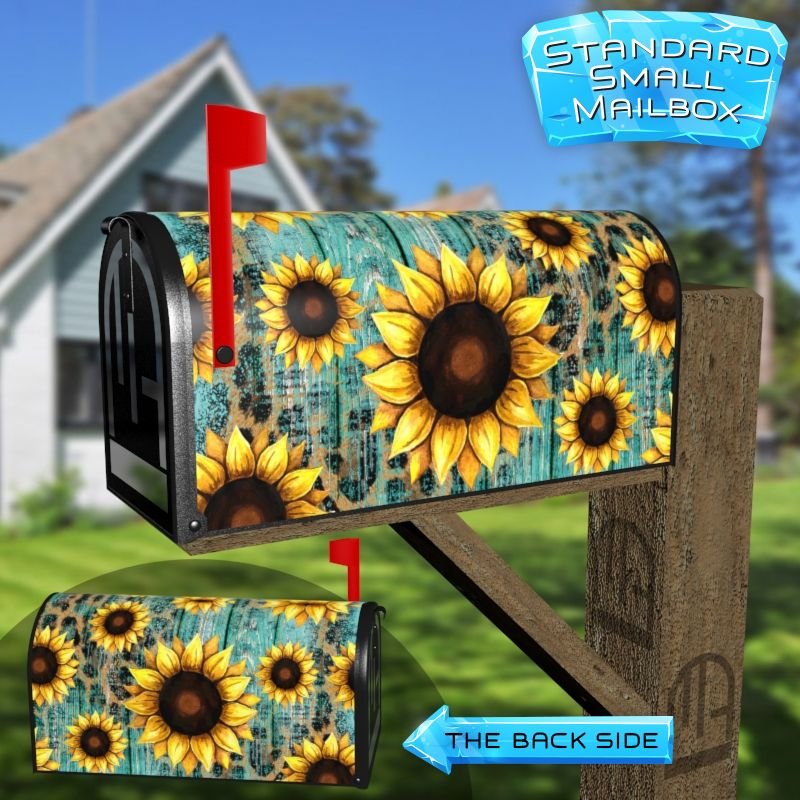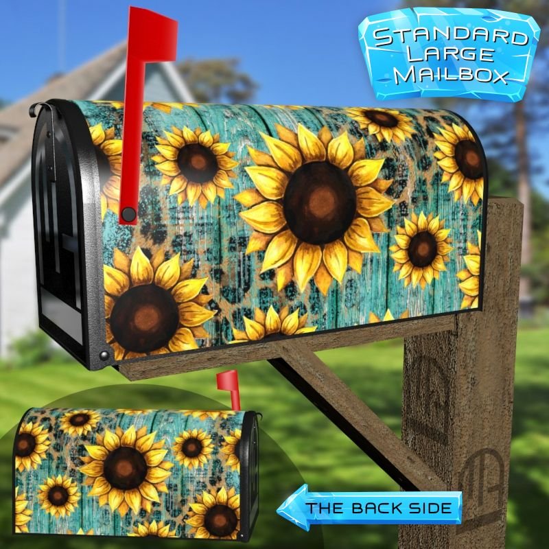 Dressing up your rural farm mailbox with the Sunflowers on Wood Pattern mailbox cover is an easy way to convert it into a unique and special item. These covers require a smooth surface, so they are compatible with rural farm mailboxes that do not have any embossed decorations or signs. Magnetic mailbox covers work with steel boxes only, while self-adhesive vinyl covers are available for aluminum, plastic and steel boxes. If your mailbox is not compatible with these covers, you can purchase a brand new mailbox with a preinstalled cover. Additionally, you have the option to create a custom rural farm mailbox cover with your own pictures, name, street number, etc.