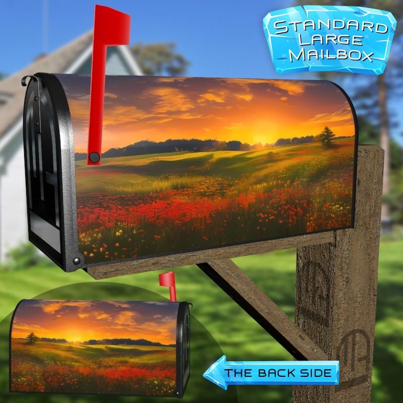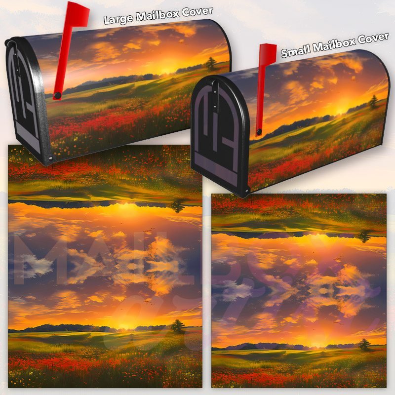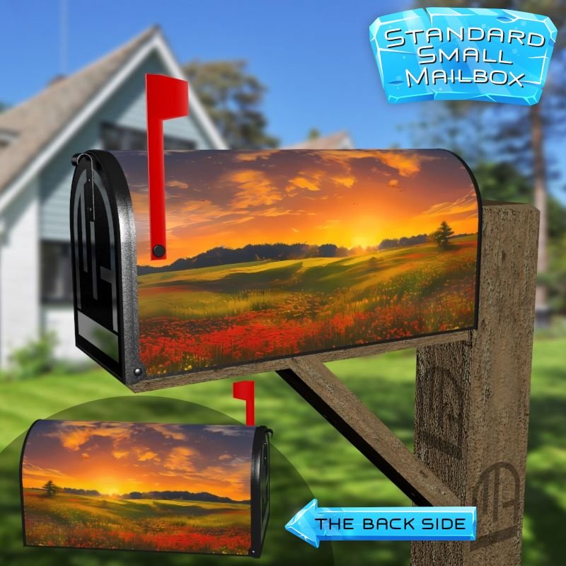 Dressing up your rural farm mailbox with the Sunrise in the Meadow #2 mailbox cover is an easy way to convert it into a unique and special item. These covers require a smooth surface, so they are compatible with rural farm mailboxes that do not have any embossed decorations or signs. Magnetic mailbox covers work with steel boxes only, while self-adhesive vinyl covers are available for aluminum, plastic and steel boxes. If your mailbox is not compatible with these covers, you can purchase a brand new mailbox with a preinstalled cover. Additionally, you have the option to create a custom rural farm mailbox cover with your own pictures, name, street number, etc.