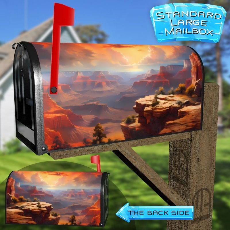 Dressing up your rural farm mailbox with the Sunset in the Grand Canyon mailbox cover is an easy way to convert it into a unique and special item. These covers require a smooth surface, so they are compatible with rural farm mailboxes that do not have any embossed decorations or signs. Magnetic mailbox covers work with steel boxes only, while self-adhesive vinyl covers are available for aluminum, plastic and steel boxes. If your mailbox is not compatible with these covers, you can purchase a brand new mailbox with a preinstalled cover. Additionally, you have the option to create a custom rural farm mailbox cover with your own pictures, name, street number, etc.