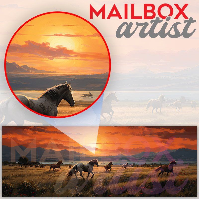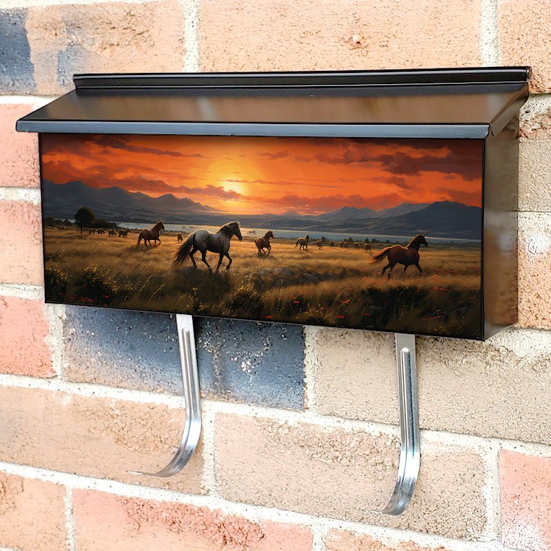 Applying your Sunset Wild Horses On Field Meadow townhouse / ranch mailbox cover it’s pretty easy to convert your mailbox to a special and unique item. These covers require a flat surface, so they work with townhouse / ranch mailboxes that do not have any embossed decoration or signs. Magnetic mailbox covers work with steel boxes, for aluminum and plastic boxes we offer the self-adhesive vinyl covers. In case your mailbox doesn’t work with these covers, you can purchase the preinstalled cover on a brand new mailbox as well. Also, you can create your custom townhouse / ranch mailbox cover using you own pictures, adding your name, street number, etc.