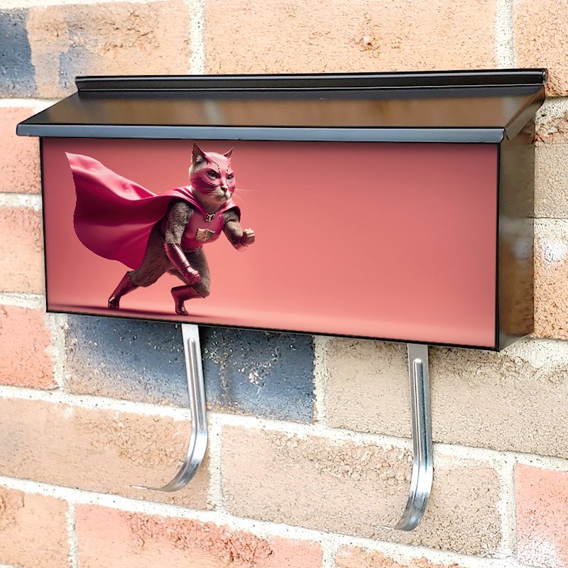 Applying your Supergod Superpet Cat As Superhero townhouse / ranch mailbox cover it’s pretty easy to convert your mailbox to a special and unique item. These covers require a flat surface, so they work with townhouse / ranch mailboxes that do not have any embossed decoration or signs. Magnetic mailbox covers work with steel boxes, for aluminum and plastic boxes we offer the self-adhesive vinyl covers. In case your mailbox doesn’t work with these covers, you can purchase the preinstalled cover on a brand new mailbox as well. Also, you can create your custom townhouse / ranch mailbox cover using you own pictures, adding your name, street number, etc.