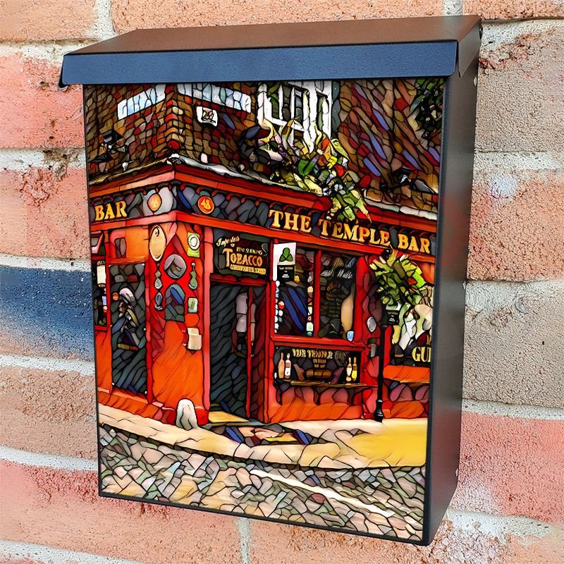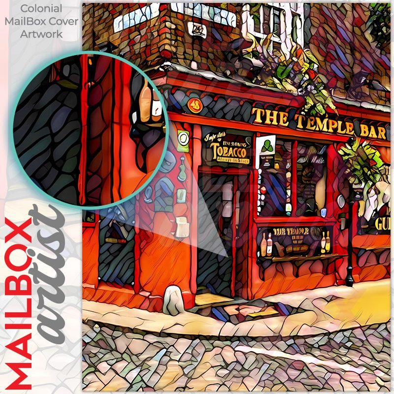 With this The Temple Bar, Dublin Stained Glass colonial mailbox cover it’s pretty easy to convert your mailbox to a special and unique item. These covers require a flat surface, so they work with colonial mailboxes that do not have any embossed decoration or signs. Magnetic mailbox covers work with steel colonial boxes only, while self-adhesive vinyl covers are available for aluminum, plastic and steel boxes. We also offer both self-adhesive and magnetic covers with regular opaque white vinyl or reflective vinyl, which works similarly to license plates or road signs. The reflective option makes the entire cover’s surface reflective, ensuring visibility at night. In case your mailbox doesn’t work with these covers, you can purchase the preinstalled cover on a brand new mailbox as well. Also, you can create your custom colonial mailbox cover using you own pictures, adding your name, street number, etc.