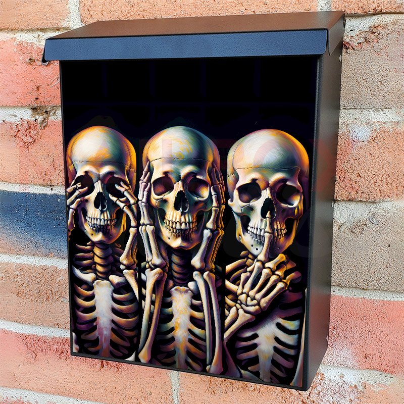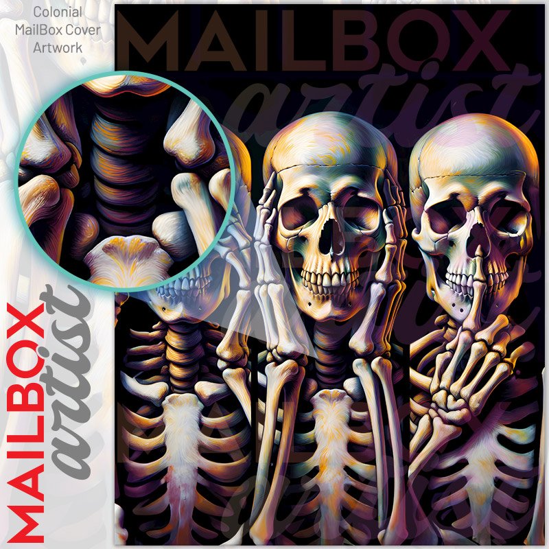 With this The Three Wise Skeletons colonial mailbox cover it’s pretty easy to convert your mailbox to a special and unique item. These covers require a flat surface, so they work with colonial mailboxes that do not have any embossed decoration or signs. Magnetic mailbox covers work with steel colonial boxes only, while self-adhesive vinyl covers are available for aluminum, plastic and steel boxes. We also offer both self-adhesive and magnetic covers with regular opaque white vinyl or reflective vinyl, which works similarly to license plates or road signs. The reflective option makes the entire cover’s surface reflective, ensuring visibility at night. In case your mailbox doesn’t work with these covers, you can purchase the preinstalled cover on a brand new mailbox as well. Also, you can create your custom colonial mailbox cover using you own pictures, adding your name, street number, etc.