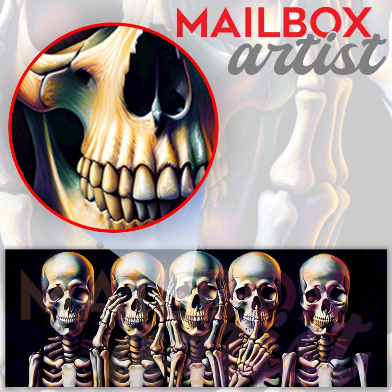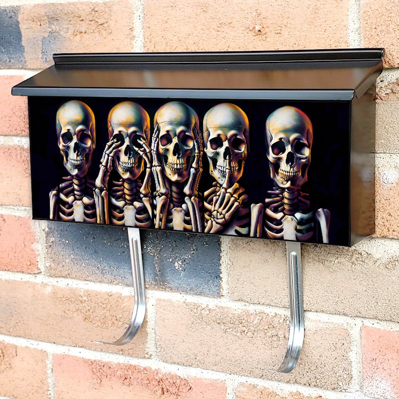 Applying your The Three Wise Skeletons townhouse / ranch mailbox cover it’s pretty easy to convert your mailbox to a special and unique item. These covers require a flat surface, so they work with townhouse / ranch mailboxes that do not have any embossed decoration or signs. Magnetic mailbox covers work with steel boxes, for aluminum and plastic boxes we offer the self-adhesive vinyl covers. In case your mailbox doesn’t work with these covers, you can purchase the preinstalled cover on a brand new mailbox as well. Also, you can create your custom townhouse / ranch mailbox cover using you own pictures, adding your name, street number, etc.