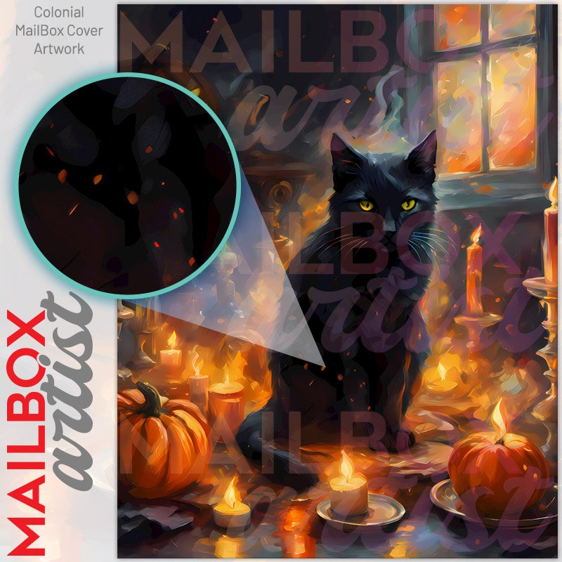 With this The Witch’s Cat colonial mailbox cover it’s pretty easy to convert your mailbox to a special and unique item. These covers require a flat surface, so they work with colonial mailboxes that do not have any embossed decoration or signs. Magnetic mailbox covers work with steel colonial boxes only, while self-adhesive vinyl covers are available for aluminum, plastic and steel boxes. We also offer both self-adhesive and magnetic covers with regular opaque white vinyl or reflective vinyl, which works similarly to license plates or road signs. The reflective option makes the entire cover’s surface reflective, ensuring visibility at night. In case your mailbox doesn’t work with these covers, you can purchase the preinstalled cover on a brand new mailbox as well. Also, you can create your custom colonial mailbox cover using you own pictures, adding your name, street number, etc.