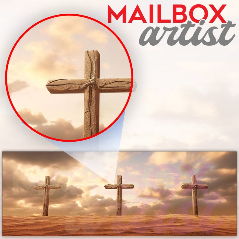 Applying your Three Crosses On A Rocky Desert Hill townhouse / ranch mailbox cover it’s pretty easy to convert your mailbox to a special and unique item. These covers require a flat surface, so they work with townhouse / ranch mailboxes that do not have any embossed decoration or signs. Magnetic mailbox covers work with steel boxes, for aluminum and plastic boxes we offer the self-adhesive vinyl covers. In case your mailbox doesn’t work with these covers, you can purchase the preinstalled cover on a brand new mailbox as well. Also, you can create your custom townhouse / ranch mailbox cover using you own pictures, adding your name, street number, etc.