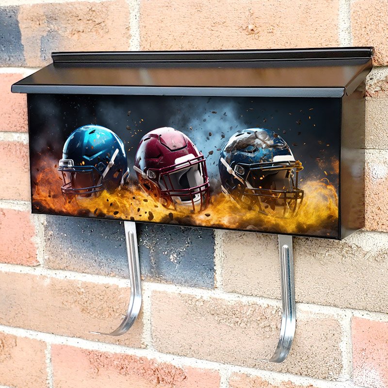 Applying your Three Football Helmets On The Ground townhouse / ranch mailbox cover it’s pretty easy to convert your mailbox to a special and unique item. These covers require a flat surface, so they work with townhouse / ranch mailboxes that do not have any embossed decoration or signs. Magnetic mailbox covers work with steel boxes, for aluminum and plastic boxes we offer the self-adhesive vinyl covers. In case your mailbox doesn’t work with these covers, you can purchase the preinstalled cover on a brand new mailbox as well. Also, you can create your custom townhouse / ranch mailbox cover using you own pictures, adding your name, street number, etc.