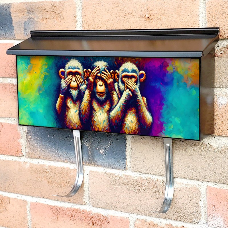 Applying your Three Wise Monkeys townhouse / ranch mailbox cover it’s pretty easy to convert your mailbox to a special and unique item. These covers require a flat surface, so they work with townhouse / ranch mailboxes that do not have any embossed decoration or signs. Magnetic mailbox covers work with steel boxes, for aluminum and plastic boxes we offer the self-adhesive vinyl covers. In case your mailbox doesn’t work with these covers, you can purchase the preinstalled cover on a brand new mailbox as well. Also, you can create your custom townhouse / ranch mailbox cover using you own pictures, adding your name, street number, etc.