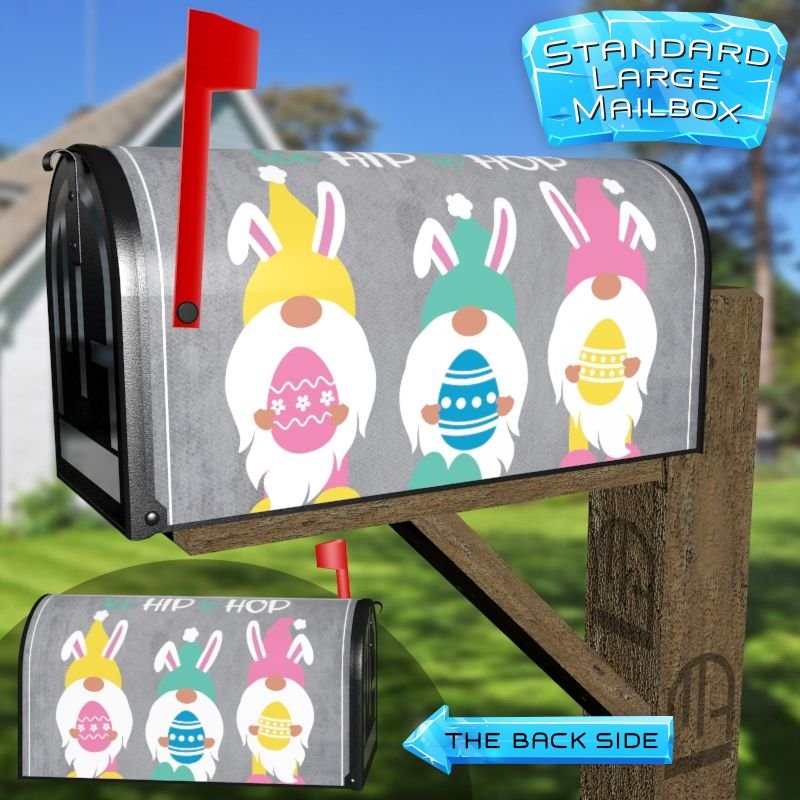 Dressing up your rural farm mailbox with the Too Hip to Hop Easter Gnomes mailbox cover is an easy way to convert it into a unique and special item. These covers require a smooth surface, so they are compatible with rural farm mailboxes that do not have any embossed decorations or signs. Magnetic mailbox covers work with steel boxes only, while self-adhesive vinyl covers are available for aluminum, plastic and steel boxes. If your mailbox is not compatible with these covers, you can purchase a brand new mailbox with a preinstalled cover. Additionally, you have the option to create a custom rural farm mailbox cover with your own pictures, name, street number, etc.