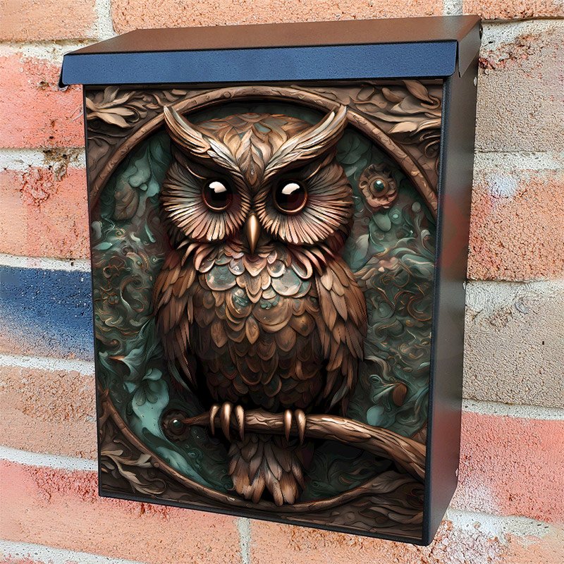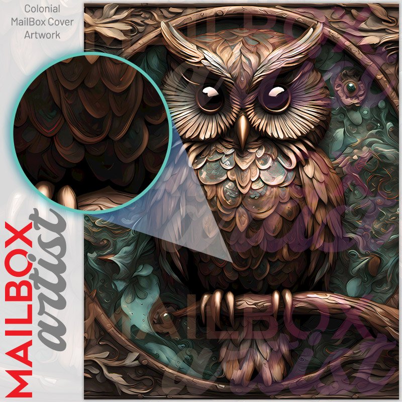 With this Tooled Leather Brown Owl colonial mailbox cover it’s pretty easy to convert your mailbox to a special and unique item. These covers require a flat surface, so they work with colonial mailboxes that do not have any embossed decoration or signs. Magnetic mailbox covers work with steel colonial boxes only, while self-adhesive vinyl covers are available for aluminum, plastic and steel boxes. We also offer both self-adhesive and magnetic covers with regular opaque white vinyl or reflective vinyl, which works similarly to license plates or road signs. The reflective option makes the entire cover’s surface reflective, ensuring visibility at night. In case your mailbox doesn’t work with these covers, you can purchase the preinstalled cover on a brand new mailbox as well. Also, you can create your custom colonial mailbox cover using you own pictures, adding your name, street number, etc.