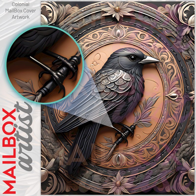 With this Tooled Leather Raven colonial mailbox cover it’s pretty easy to convert your mailbox to a special and unique item. These covers require a flat surface, so they work with colonial mailboxes that do not have any embossed decoration or signs. Magnetic mailbox covers work with steel colonial boxes only, while self-adhesive vinyl covers are available for aluminum, plastic and steel boxes. We also offer both self-adhesive and magnetic covers with regular opaque white vinyl or reflective vinyl, which works similarly to license plates or road signs. The reflective option makes the entire cover’s surface reflective, ensuring visibility at night. In case your mailbox doesn’t work with these covers, you can purchase the preinstalled cover on a brand new mailbox as well. Also, you can create your custom colonial mailbox cover using you own pictures, adding your name, street number, etc.