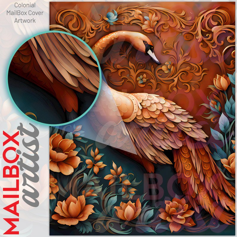 With this Tooled Leather Swan Design colonial mailbox cover it’s pretty easy to convert your mailbox to a special and unique item. These covers require a flat surface, so they work with colonial mailboxes that do not have any embossed decoration or signs. Magnetic mailbox covers work with steel colonial boxes only, while self-adhesive vinyl covers are available for aluminum, plastic and steel boxes. We also offer both self-adhesive and magnetic covers with regular opaque white vinyl or reflective vinyl, which works similarly to license plates or road signs. The reflective option makes the entire cover’s surface reflective, ensuring visibility at night. In case your mailbox doesn’t work with these covers, you can purchase the preinstalled cover on a brand new mailbox as well. Also, you can create your custom colonial mailbox cover using you own pictures, adding your name, street number, etc.