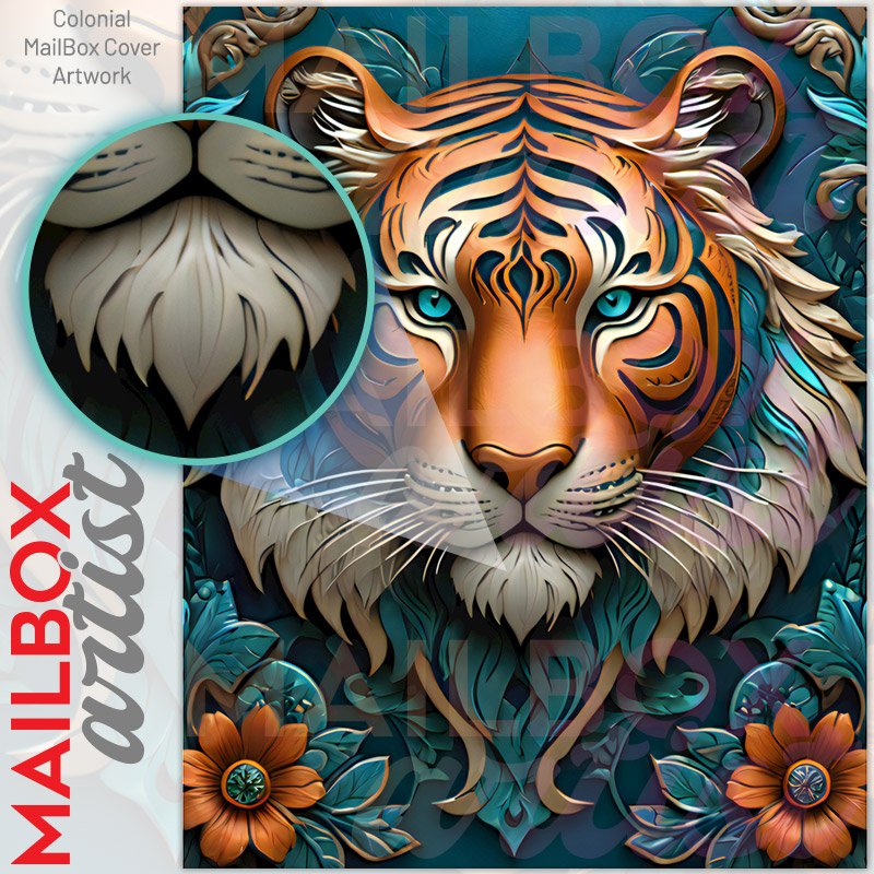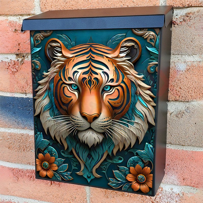With this Tooled Leather Tiger and Flowers colonial mailbox cover it’s pretty easy to convert your mailbox to a special and unique item. These covers require a flat surface, so they work with colonial mailboxes that do not have any embossed decoration or signs. Magnetic mailbox covers work with steel colonial boxes only, while self-adhesive vinyl covers are available for aluminum, plastic and steel boxes. We also offer both self-adhesive and magnetic covers with regular opaque white vinyl or reflective vinyl, which works similarly to license plates or road signs. The reflective option makes the entire cover’s surface reflective, ensuring visibility at night. In case your mailbox doesn’t work with these covers, you can purchase the preinstalled cover on a brand new mailbox as well. Also, you can create your custom colonial mailbox cover using you own pictures, adding your name, street number, etc.