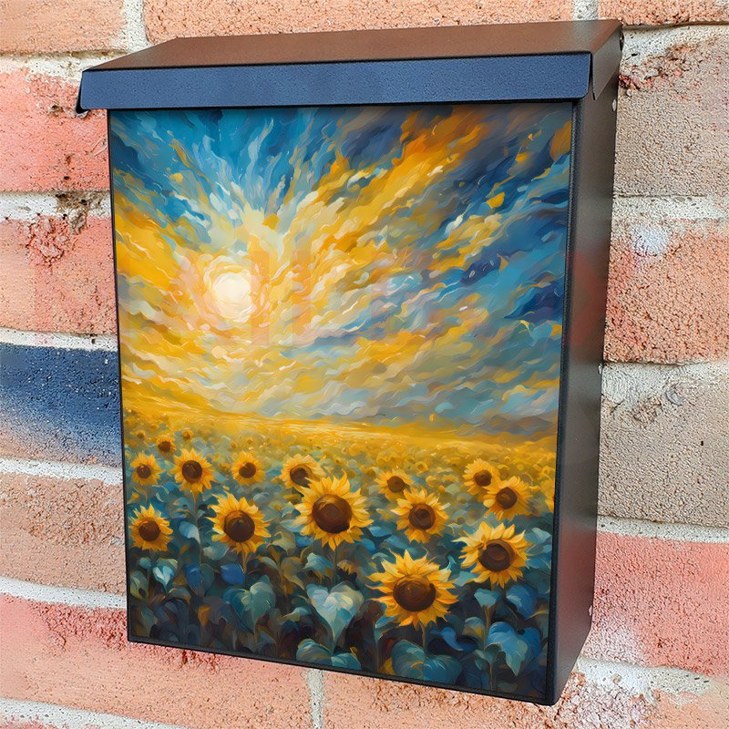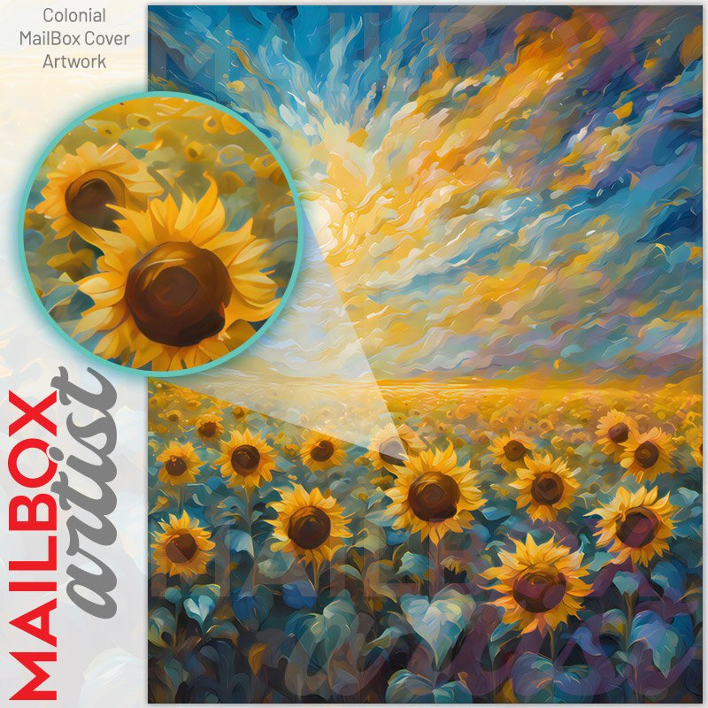 With this Tuscan Morning Sunflowers colonial mailbox cover it’s pretty easy to convert your mailbox to a special and unique item. These covers require a flat surface, so they work with colonial mailboxes that do not have any embossed decoration or signs. Magnetic mailbox covers work with steel colonial boxes only, while self-adhesive vinyl covers are available for aluminum, plastic and steel boxes. We also offer both self-adhesive and magnetic covers with regular opaque white vinyl or reflective vinyl, which works similarly to license plates or road signs. The reflective option makes the entire cover’s surface reflective, ensuring visibility at night. In case your mailbox doesn’t work with these covers, you can purchase the preinstalled cover on a brand new mailbox as well. Also, you can create your custom colonial mailbox cover using you own pictures, adding your name, street number, etc.