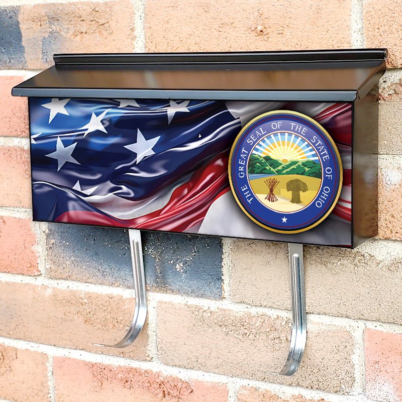 Applying your US States Ohio State Seal townhouse / ranch mailbox cover it’s pretty easy to convert your mailbox to a special and unique item. These covers require a flat surface, so they work with townhouse / ranch mailboxes that do not have any embossed decoration or signs. Magnetic mailbox covers work with steel boxes, for aluminum and plastic boxes we offer the self-adhesive vinyl covers. In case your mailbox doesn’t work with these covers, you can purchase the preinstalled cover on a brand new mailbox as well. Also, you can create your custom townhouse / ranch mailbox cover using you own pictures, adding your name, street number, etc.