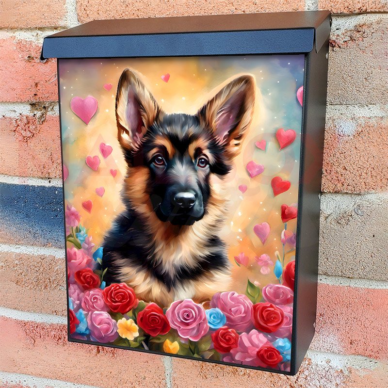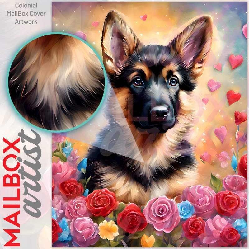 With this Valentiine’s Day Puppy colonial mailbox cover it’s pretty easy to convert your mailbox to a special and unique item. These covers require a flat surface, so they work with colonial mailboxes that do not have any embossed decoration or signs. Magnetic mailbox covers work with steel colonial boxes only, while self-adhesive vinyl covers are available for aluminum, plastic and steel boxes. We also offer both self-adhesive and magnetic covers with regular opaque white vinyl or reflective vinyl, which works similarly to license plates or road signs. The reflective option makes the entire cover’s surface reflective, ensuring visibility at night. In case your mailbox doesn’t work with these covers, you can purchase the preinstalled cover on a brand new mailbox as well. Also, you can create your custom colonial mailbox cover using you own pictures, adding your name, street number, etc.