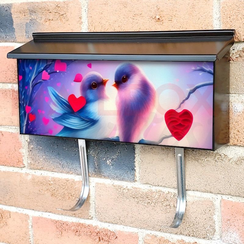Applying your Valentine’s Bird Couple with Hearts townhouse / ranch mailbox cover it’s pretty easy to convert your mailbox to a special and unique item. These covers require a flat surface, so they work with townhouse / ranch mailboxes that do not have any embossed decoration or signs. Magnetic mailbox covers work with steel boxes, for aluminum and plastic boxes we offer the self-adhesive vinyl covers. In case your mailbox doesn’t work with these covers, you can purchase the preinstalled cover on a brand new mailbox as well. Also, you can create your custom townhouse / ranch mailbox cover using you own pictures, adding your name, street number, etc.