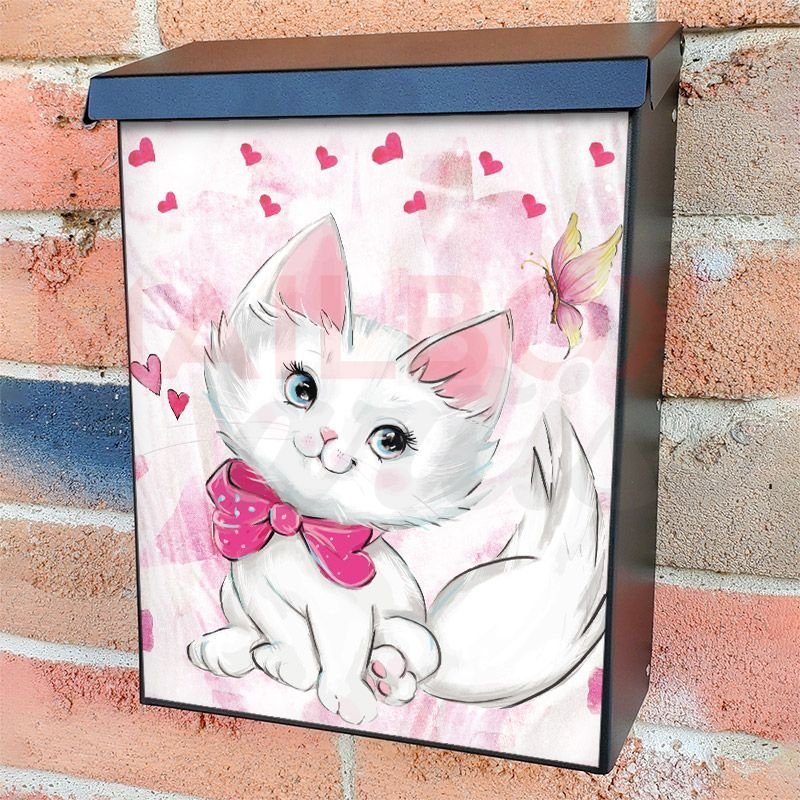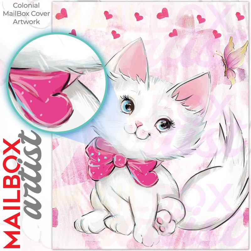 With this Valentine’s Day Kitten and Hearts colonial mailbox cover it’s pretty easy to convert your mailbox to a special and unique item. These covers require a flat surface, so they work with colonial mailboxes that do not have any embossed decoration or signs. Magnetic mailbox covers work with steel colonial boxes only, while self-adhesive vinyl covers are available for aluminum, plastic and steel boxes. We also offer both self-adhesive and magnetic covers with regular opaque white vinyl or reflective vinyl, which works similarly to license plates or road signs. The reflective option makes the entire cover’s surface reflective, ensuring visibility at night. In case your mailbox doesn’t work with these covers, you can purchase the preinstalled cover on a brand new mailbox as well. Also, you can create your custom colonial mailbox cover using you own pictures, adding your name, street number, etc.