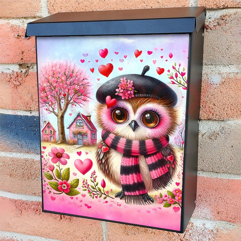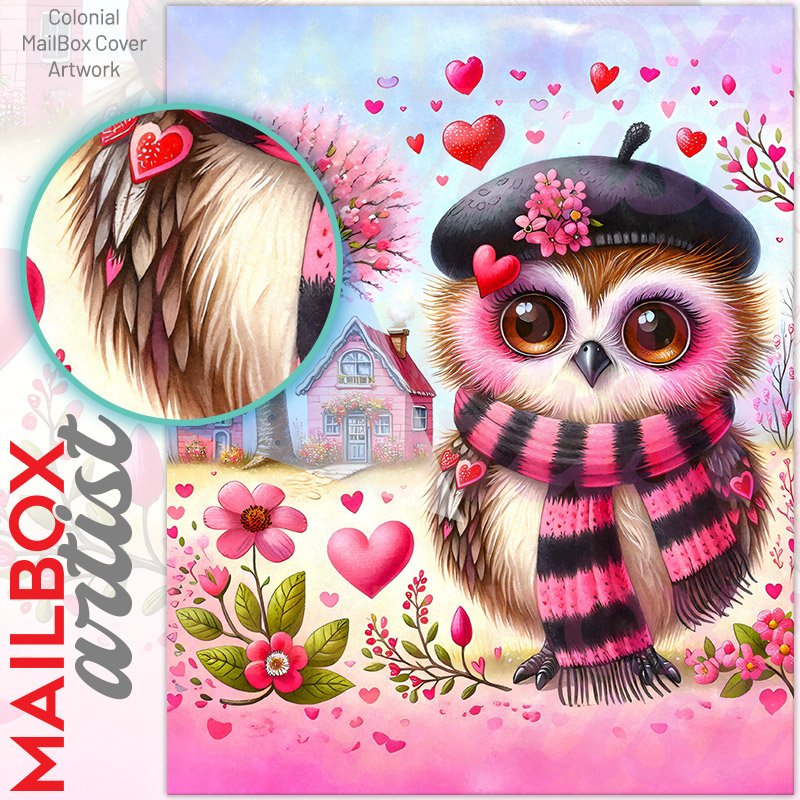 With this Valentine’s Day Owl colonial mailbox cover it’s pretty easy to convert your mailbox to a special and unique item. These covers require a flat surface, so they work with colonial mailboxes that do not have any embossed decoration or signs. Magnetic mailbox covers work with steel colonial boxes only, while self-adhesive vinyl covers are available for aluminum, plastic and steel boxes. We also offer both self-adhesive and magnetic covers with regular opaque white vinyl or reflective vinyl, which works similarly to license plates or road signs. The reflective option makes the entire cover’s surface reflective, ensuring visibility at night. In case your mailbox doesn’t work with these covers, you can purchase the preinstalled cover on a brand new mailbox as well. Also, you can create your custom colonial mailbox cover using you own pictures, adding your name, street number, etc.