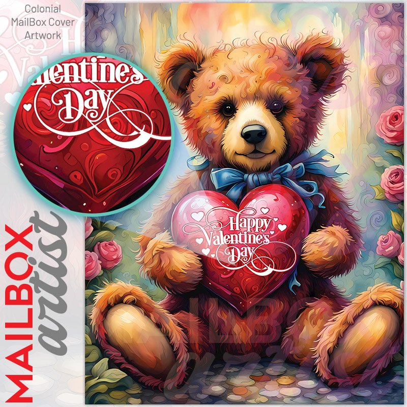 With this Valentine’s Day Teddy Bear with a Heart colonial mailbox cover it’s pretty easy to convert your mailbox to a special and unique item. These covers require a flat surface, so they work with colonial mailboxes that do not have any embossed decoration or signs. Magnetic mailbox covers work with steel colonial boxes only, while self-adhesive vinyl covers are available for aluminum, plastic and steel boxes. We also offer both self-adhesive and magnetic covers with regular opaque white vinyl or reflective vinyl, which works similarly to license plates or road signs. The reflective option makes the entire cover’s surface reflective, ensuring visibility at night. In case your mailbox doesn’t work with these covers, you can purchase the preinstalled cover on a brand new mailbox as well. Also, you can create your custom colonial mailbox cover using you own pictures, adding your name, street number, etc.