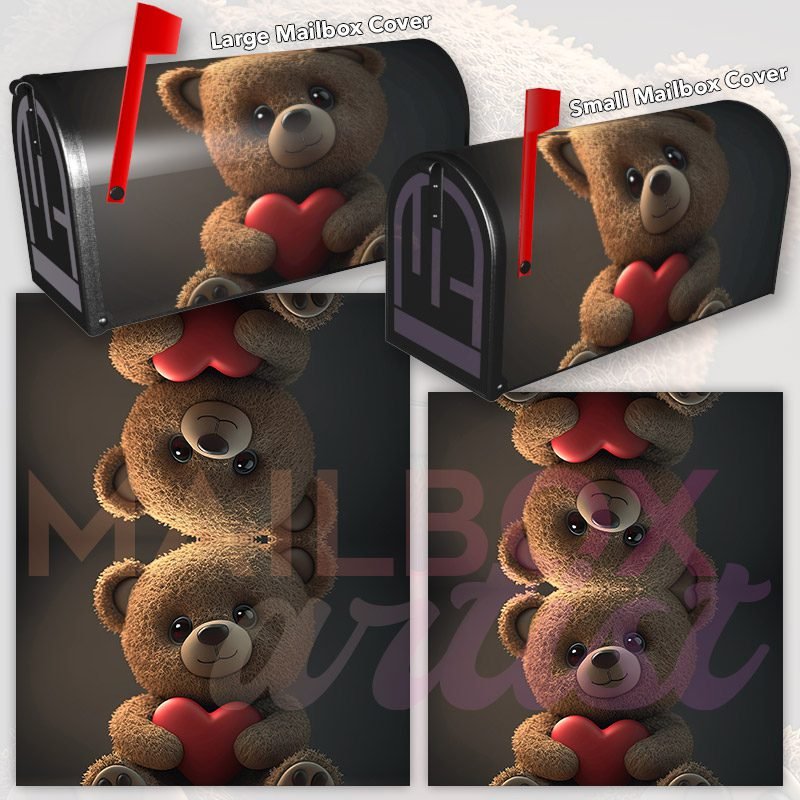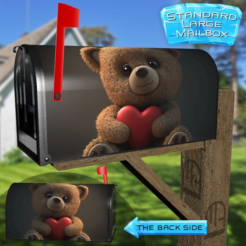 Dressing up your rural farm mailbox with the Valentine’s Teddy Bear & Heart #4 mailbox cover is an easy way to convert it into a unique and special item. These covers require a smooth surface, so they are compatible with rural farm mailboxes that do not have any embossed decorations or signs. Magnetic mailbox covers work with steel boxes only, while self-adhesive vinyl covers are available for aluminum, plastic and steel boxes. If your mailbox is not compatible with these covers, you can purchase a brand new mailbox with a preinstalled cover. Additionally, you have the option to create a custom rural farm mailbox cover with your own pictures, name, street number, etc.