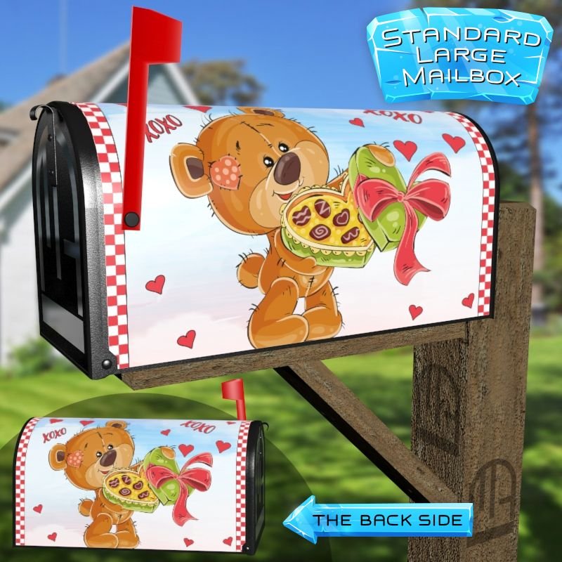 Dressing up your rural farm mailbox with the Valentine’s Teddy Bear with Chocolate mailbox cover is an easy way to convert it into a unique and special item. These covers require a smooth surface, so they are compatible with rural farm mailboxes that do not have any embossed decorations or signs. Magnetic mailbox covers work with steel boxes only, while self-adhesive vinyl covers are available for aluminum, plastic and steel boxes. If your mailbox is not compatible with these covers, you can purchase a brand new mailbox with a preinstalled cover. Additionally, you have the option to create a custom rural farm mailbox cover with your own pictures, name, street number, etc.