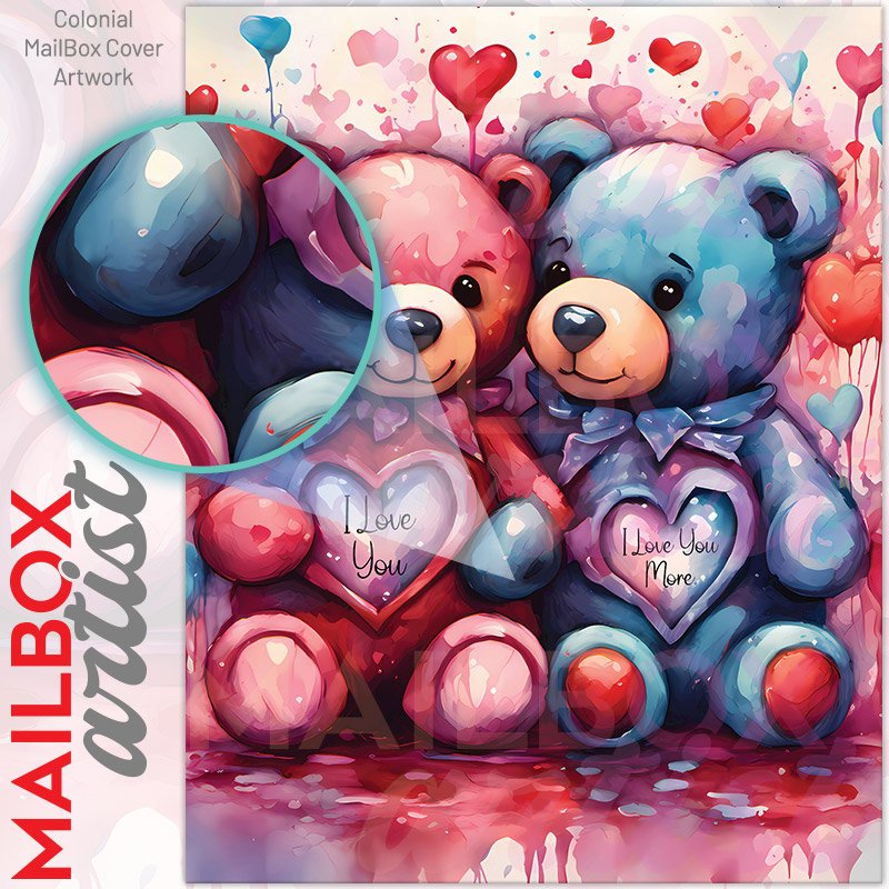 With this Valentine’s Teddy Bears with Hearts colonial mailbox cover it’s pretty easy to convert your mailbox to a special and unique item. These covers require a flat surface, so they work with colonial mailboxes that do not have any embossed decoration or signs. Magnetic mailbox covers work with steel colonial boxes only, while self-adhesive vinyl covers are available for aluminum, plastic and steel boxes. We also offer both self-adhesive and magnetic covers with regular opaque white vinyl or reflective vinyl, which works similarly to license plates or road signs. The reflective option makes the entire cover’s surface reflective, ensuring visibility at night. In case your mailbox doesn’t work with these covers, you can purchase the preinstalled cover on a brand new mailbox as well. Also, you can create your custom colonial mailbox cover using you own pictures, adding your name, street number, etc.