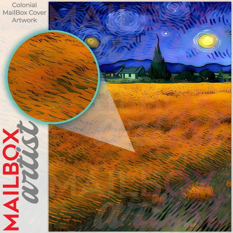 With this Van Gogh Style Summer Landscape colonial mailbox cover it’s pretty easy to convert your mailbox to a special and unique item. These covers require a flat surface, so they work with colonial mailboxes that do not have any embossed decoration or signs. Magnetic mailbox covers work with steel colonial boxes only, while self-adhesive vinyl covers are available for aluminum, plastic and steel boxes. We also offer both self-adhesive and magnetic covers with regular opaque white vinyl or reflective vinyl, which works similarly to license plates or road signs. The reflective option makes the entire cover’s surface reflective, ensuring visibility at night. In case your mailbox doesn’t work with these covers, you can purchase the preinstalled cover on a brand new mailbox as well. Also, you can create your custom colonial mailbox cover using you own pictures, adding your name, street number, etc.
