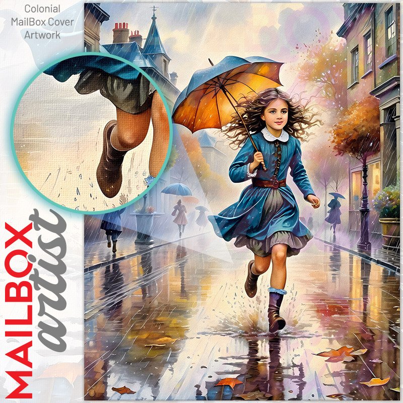 With this Victorian Girl in the Rain colonial mailbox cover it’s pretty easy to convert your mailbox to a special and unique item. These covers require a flat surface, so they work with colonial mailboxes that do not have any embossed decoration or signs. Magnetic mailbox covers work with steel colonial boxes only, while self-adhesive vinyl covers are available for aluminum, plastic and steel boxes. We also offer both self-adhesive and magnetic covers with regular opaque white vinyl or reflective vinyl, which works similarly to license plates or road signs. The reflective option makes the entire cover’s surface reflective, ensuring visibility at night. In case your mailbox doesn’t work with these covers, you can purchase the preinstalled cover on a brand new mailbox as well. Also, you can create your custom colonial mailbox cover using you own pictures, adding your name, street number, etc.
