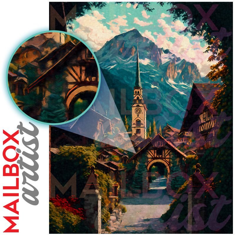With this Village in the Swiss Alps colonial mailbox cover it’s pretty easy to convert your mailbox to a special and unique item. These covers require a flat surface, so they work with colonial mailboxes that do not have any embossed decoration or signs. In case your mailbox doesn’t work with these covers, you can purchase the preinstalled cover on a brand new mailbox as well. Also, you can create your custom colonial mailbox cover using you own pictures, adding your name, street number, etc.