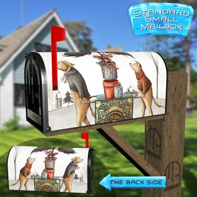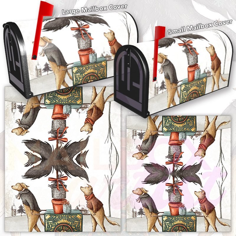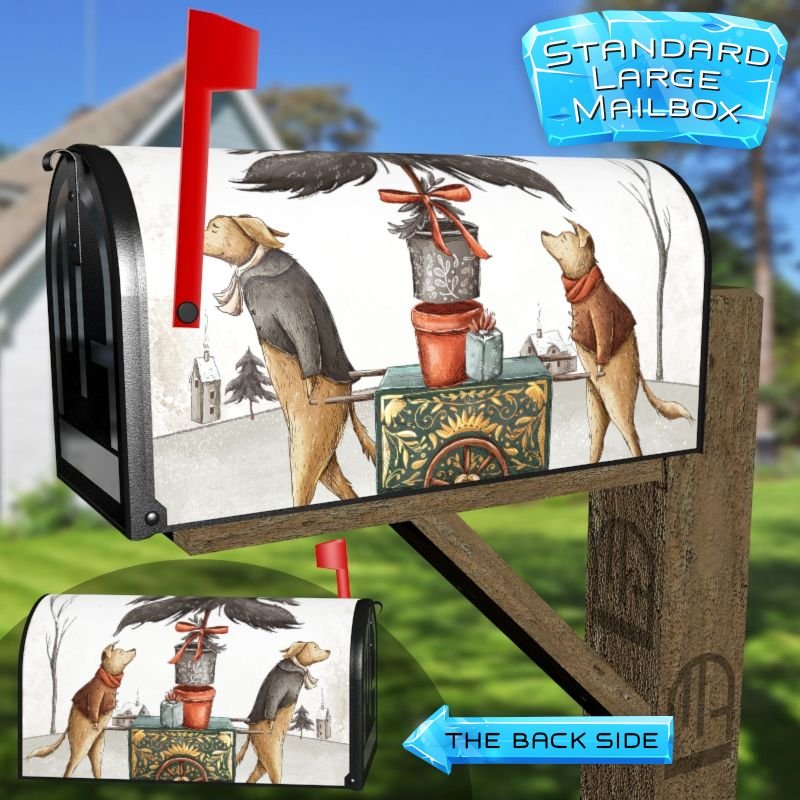 Dressing up your rural farm mailbox with the Vintage Christmas Dogs #1 mailbox cover is an easy way to convert it into a unique and special item. These covers require a smooth surface, so they are compatible with rural farm mailboxes that do not have any embossed decorations or signs. Magnetic mailbox covers work with steel boxes only, while self-adhesive vinyl covers are available for aluminum, plastic and steel boxes. If your mailbox is not compatible with these covers, you can purchase a brand new mailbox with a preinstalled cover. Additionally, you have the option to create a custom rural farm mailbox cover with your own pictures, name, street number, etc.