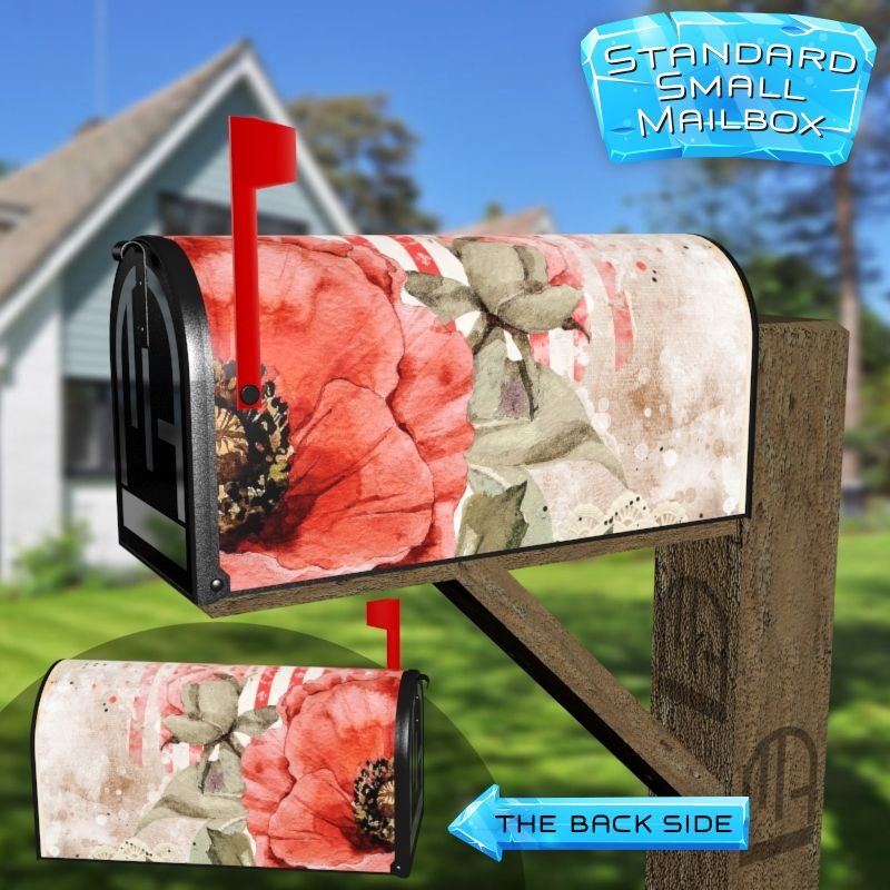 Dressing up your rural farm mailbox with the Vintage Poppy Design #2 mailbox cover is an easy way to convert it into a unique and special item. These covers require a smooth surface, so they are compatible with rural farm mailboxes that do not have any embossed decorations or signs. Magnetic mailbox covers work with steel boxes only, while self-adhesive vinyl covers are available for aluminum, plastic and steel boxes. If your mailbox is not compatible with these covers, you can purchase a brand new mailbox with a preinstalled cover. Additionally, you have the option to create a custom rural farm mailbox cover with your own pictures, name, street number, etc.