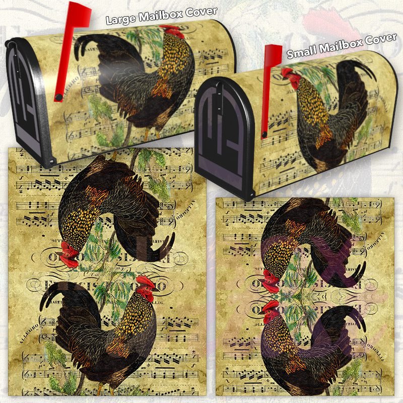 Dressing up your rural farm mailbox with the Vintage Rooster Postcard Design #2 mailbox cover is an easy way to convert it into a unique and special item. These covers require a smooth surface, so they are compatible with rural farm mailboxes that do not have any embossed decorations or signs. Magnetic mailbox covers work with steel boxes only, while self-adhesive vinyl covers are available for aluminum, plastic and steel boxes. If your mailbox is not compatible with these covers, you can purchase a brand new mailbox with a preinstalled cover. Additionally, you have the option to create a custom rural farm mailbox cover with your own pictures, name, street number, etc.
